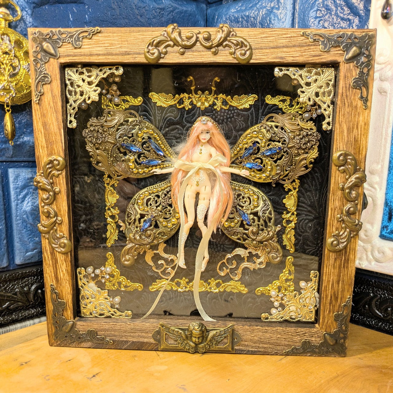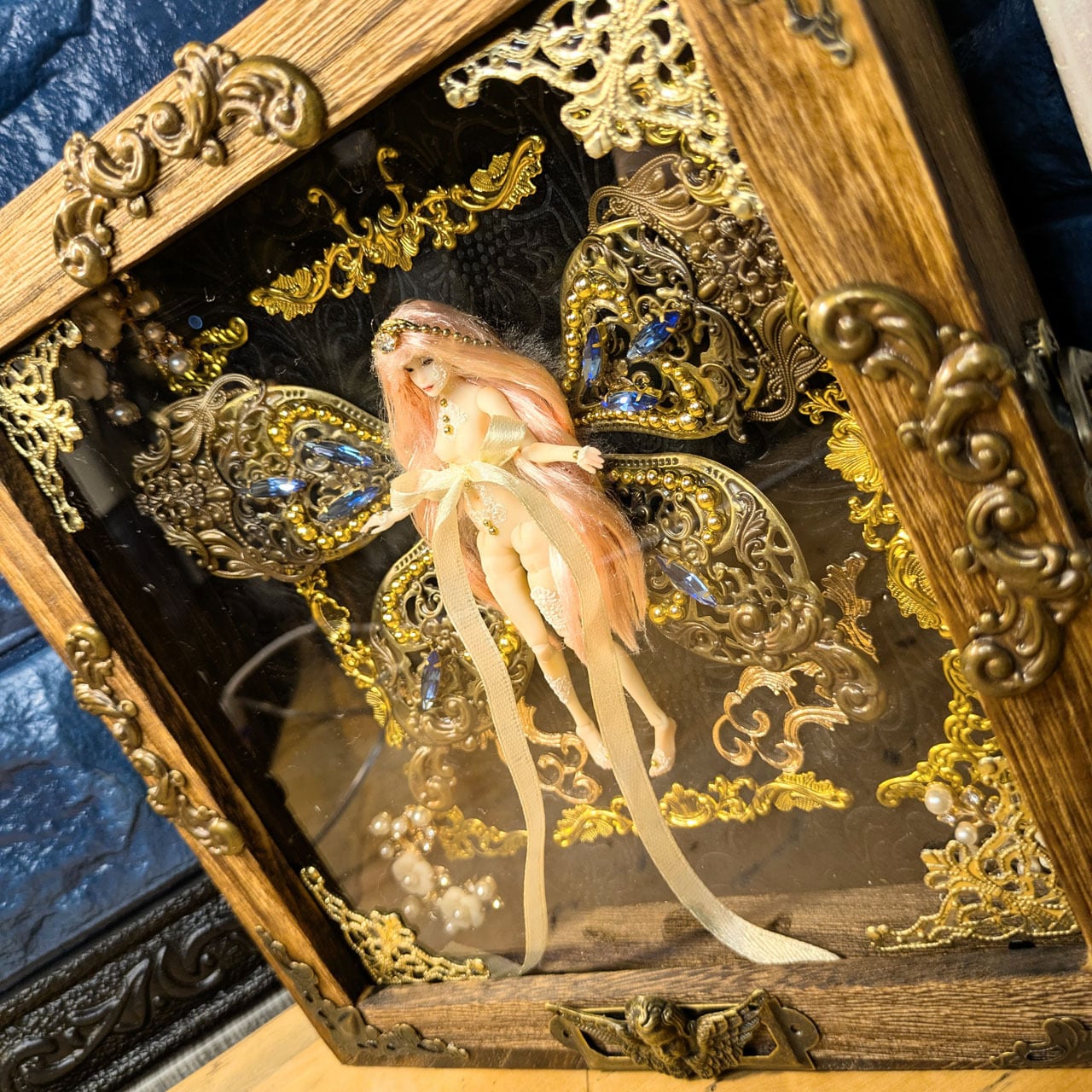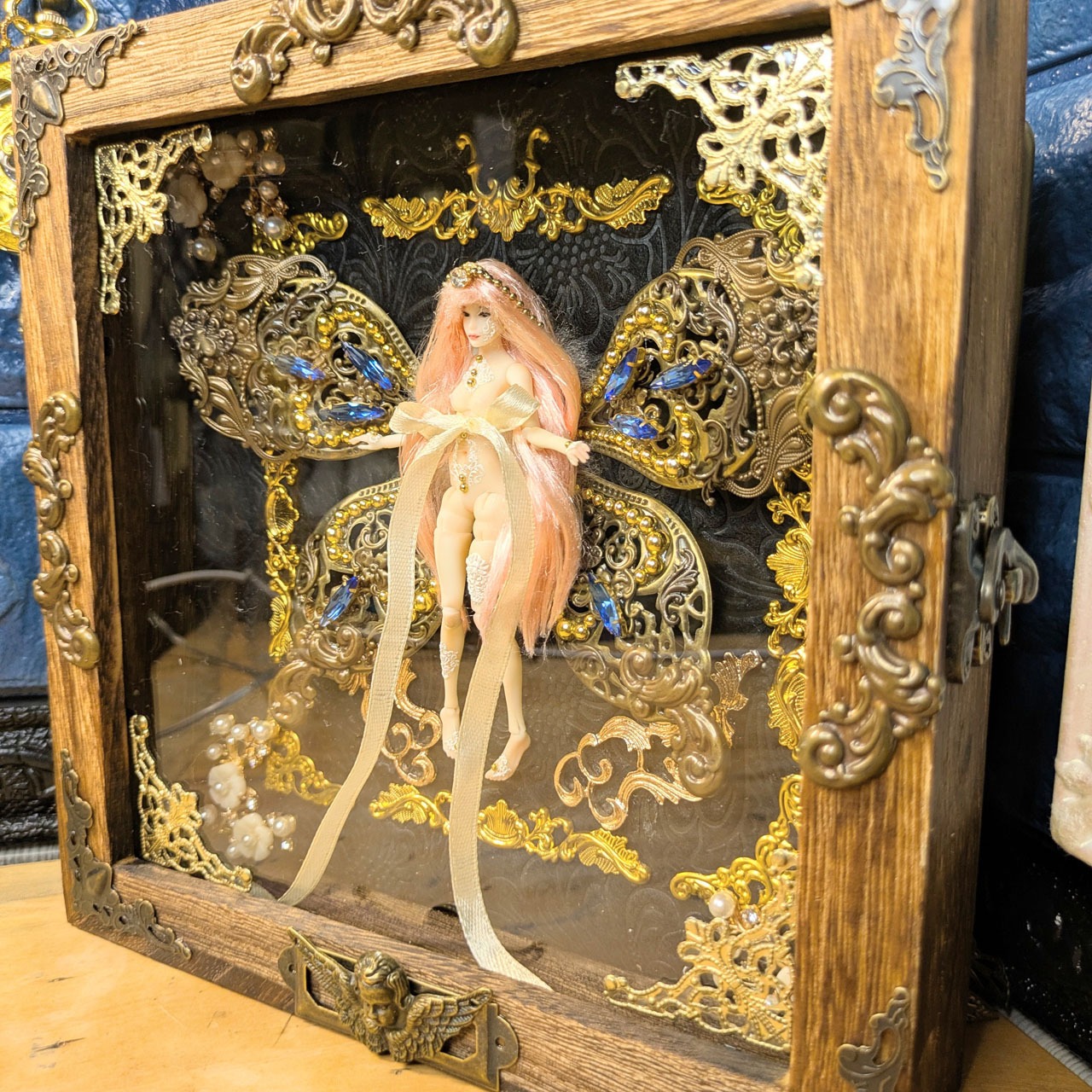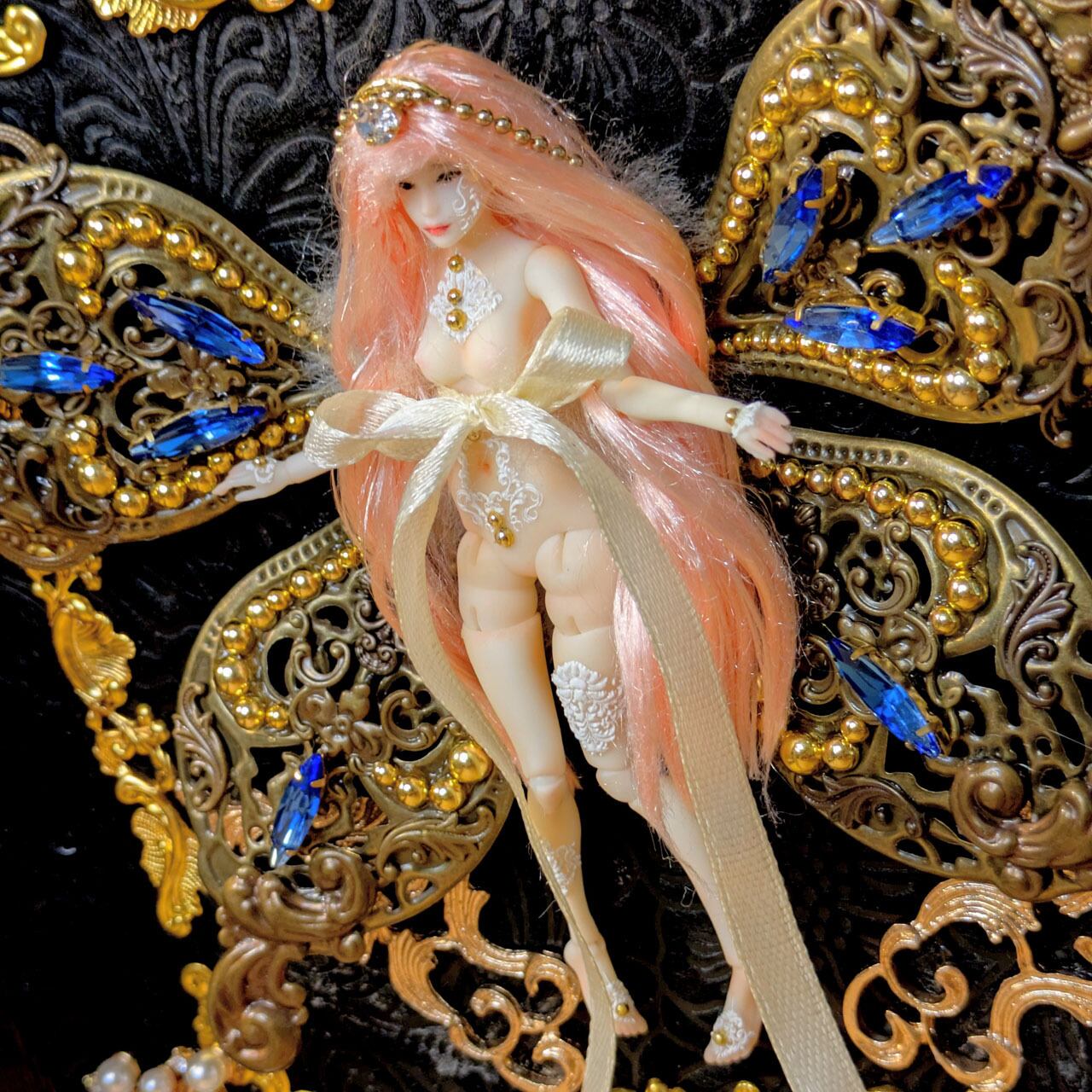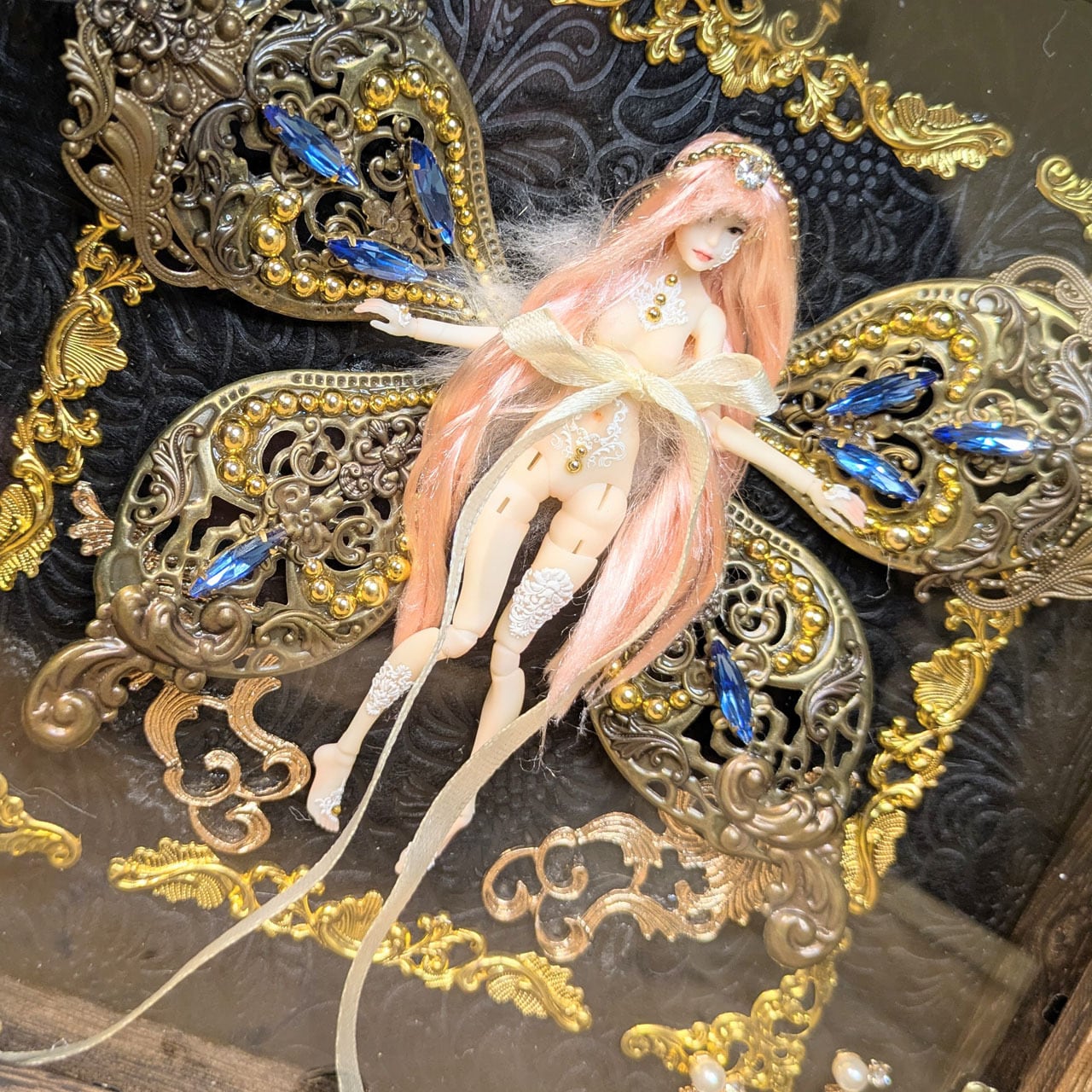 球体関節人形を妖精に見立てた作品になっており、ドールはリボンで固定してあり取り外しが可能です。