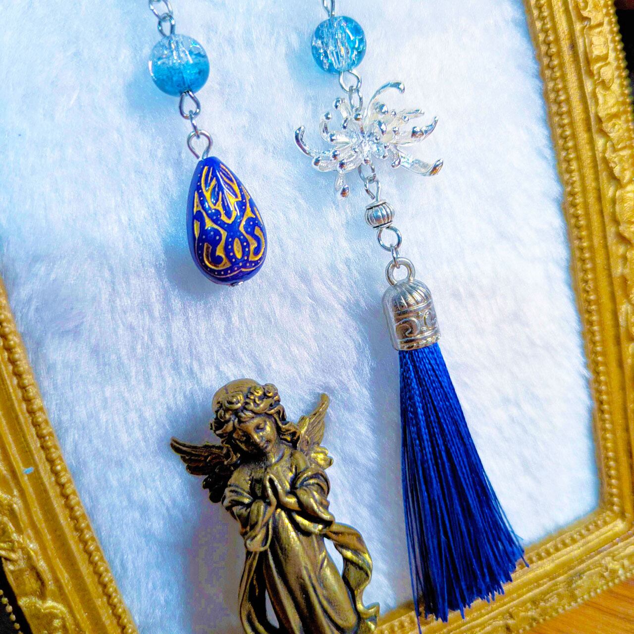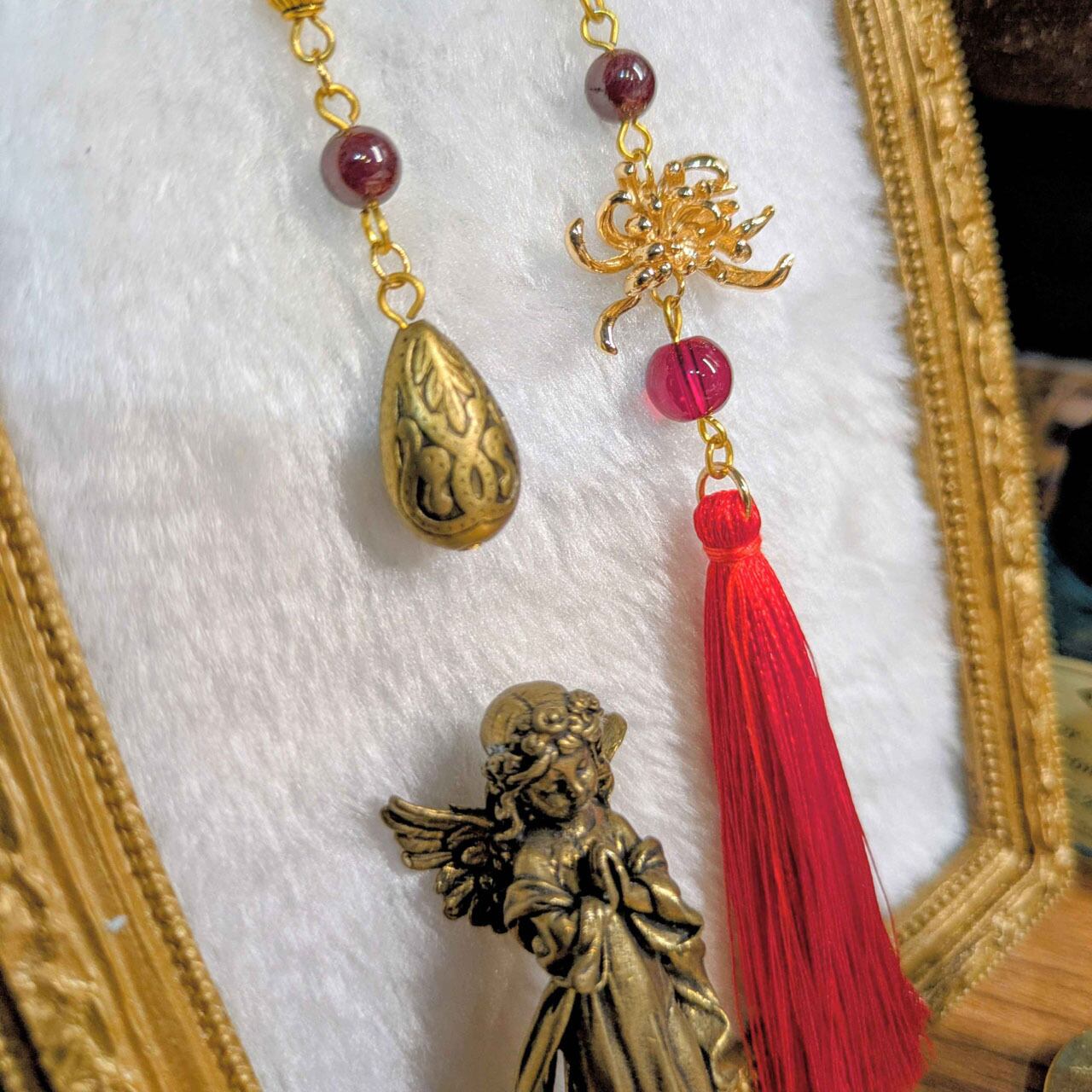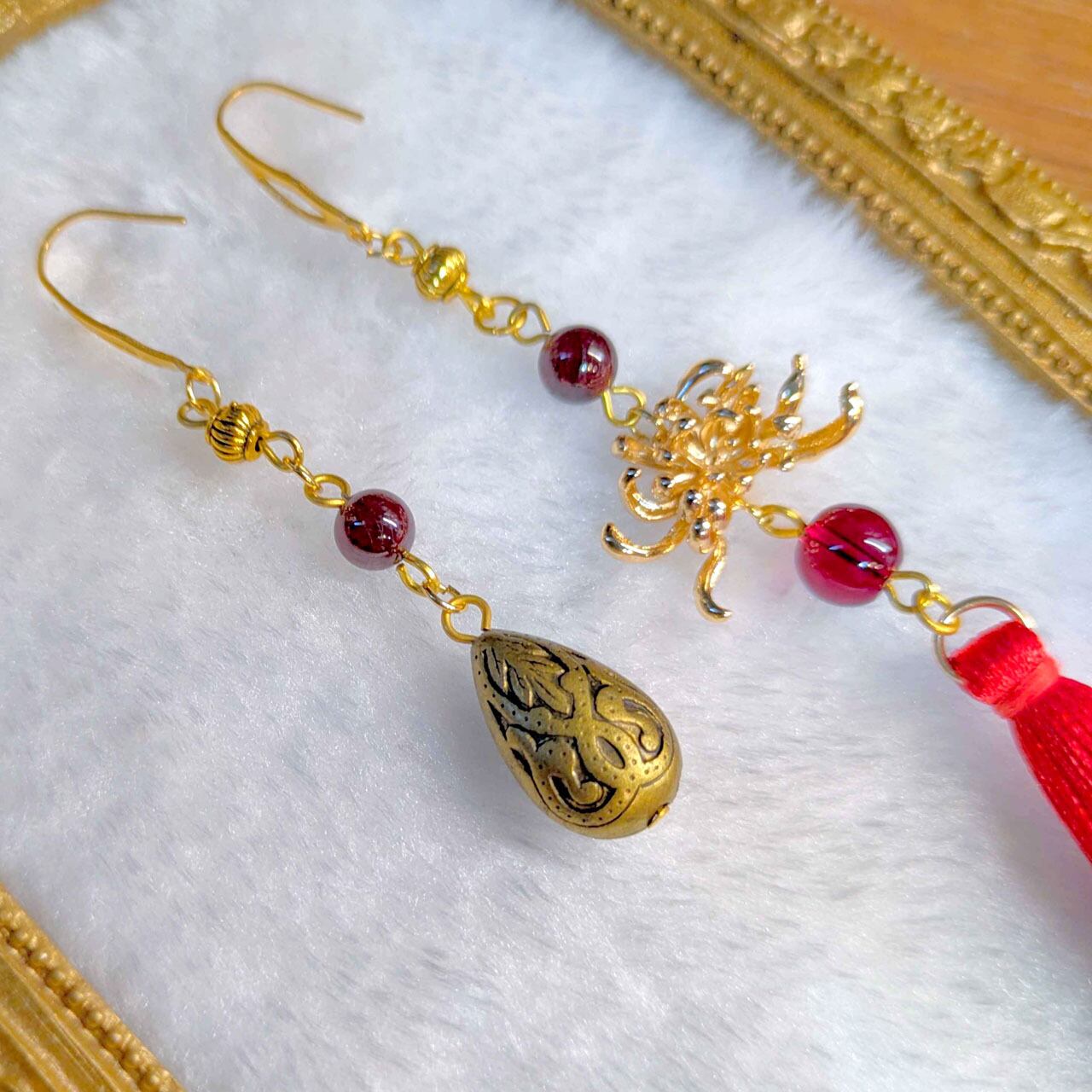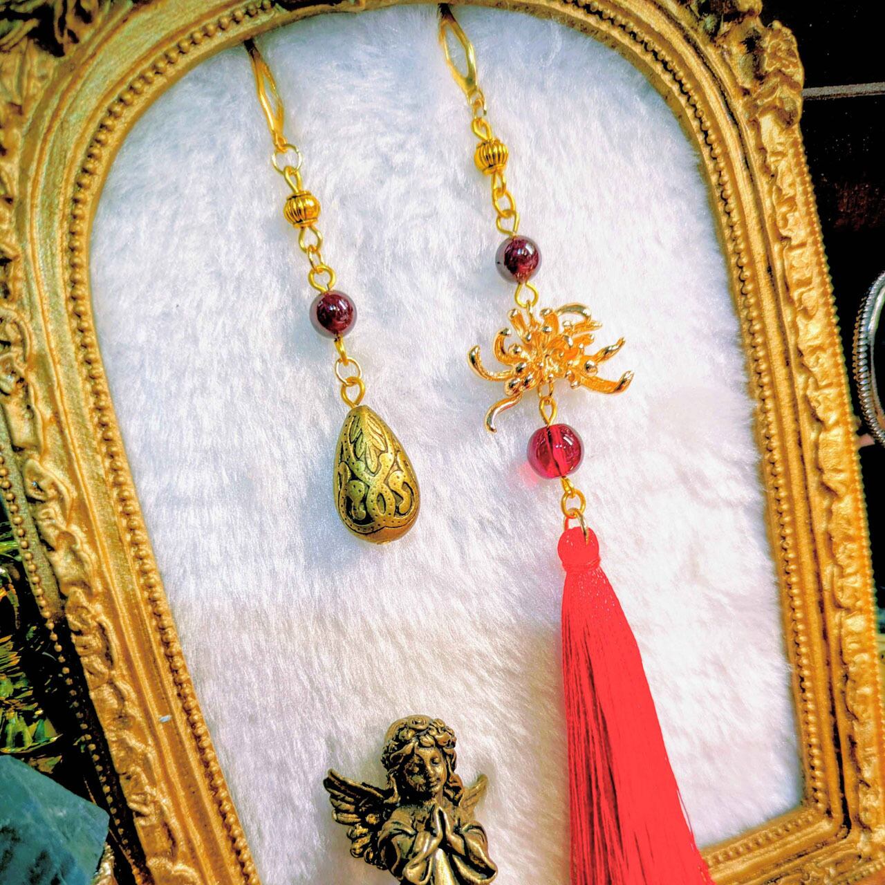 メタルパーツの彼岸花に、雫の装飾と揺れる房飾りを組み合わせ、