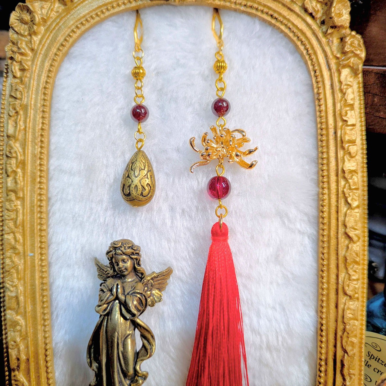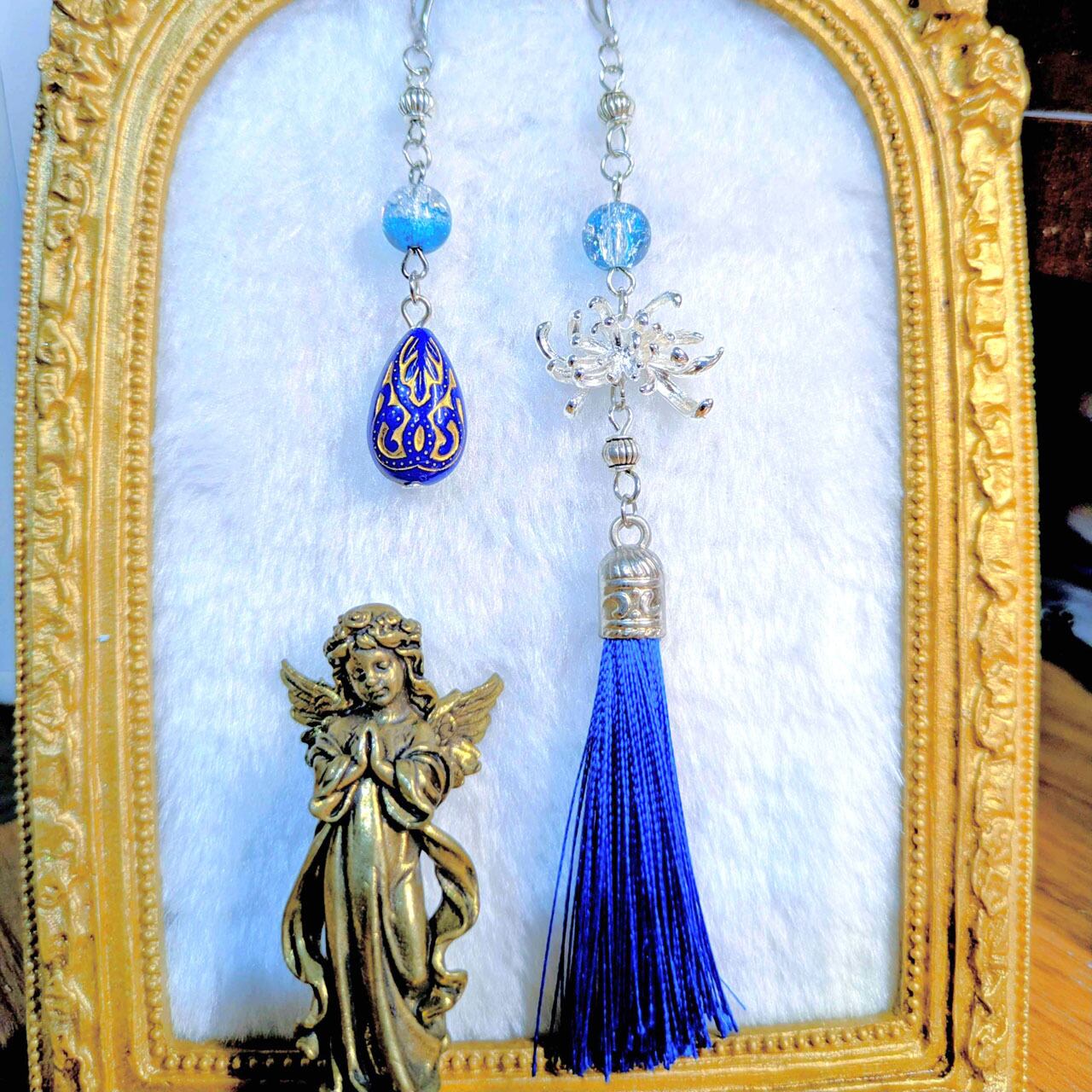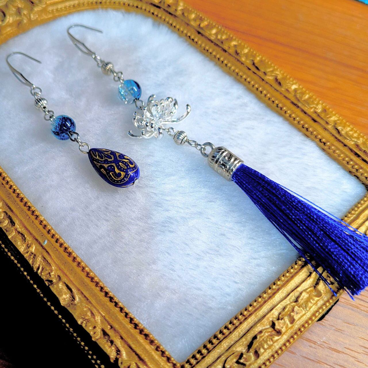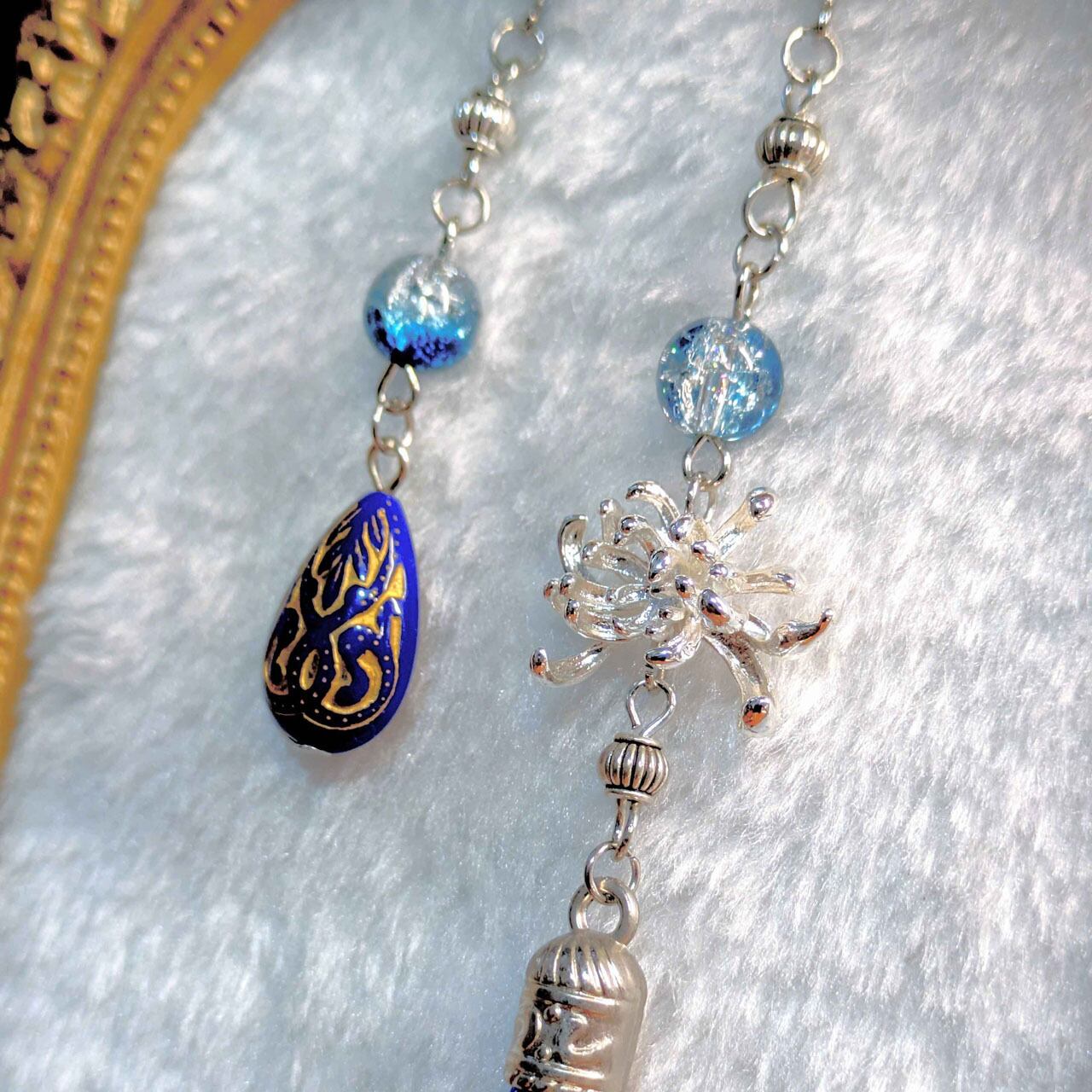 メタルパーツの彼岸花に、雫の装飾と揺れる房飾りを組み合わせ、