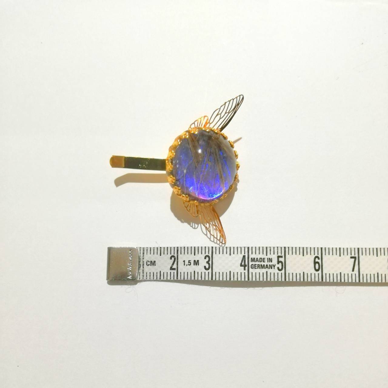 本物のモルフォ蝶の翅をガラスに封じ込めたポニーフックです。