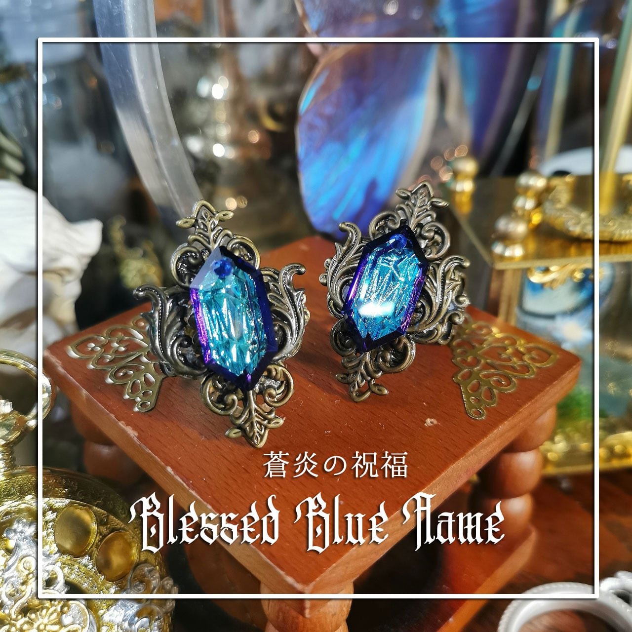 青いガラスに宝石のようなカットが施してある炎のように輝くリング。